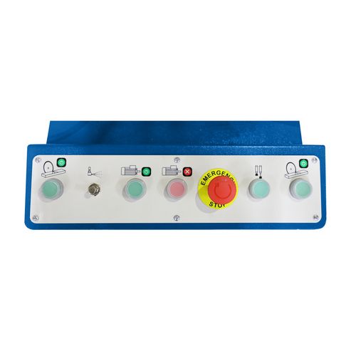 • Bedienelemente von links nach rechts: Sägen Start Schalter links, Dosierbare Minimalmengenschmierung, Motor EIN, Motor AUS, NOT-AUS , Spannen, Sägen Start Schalter rechts
