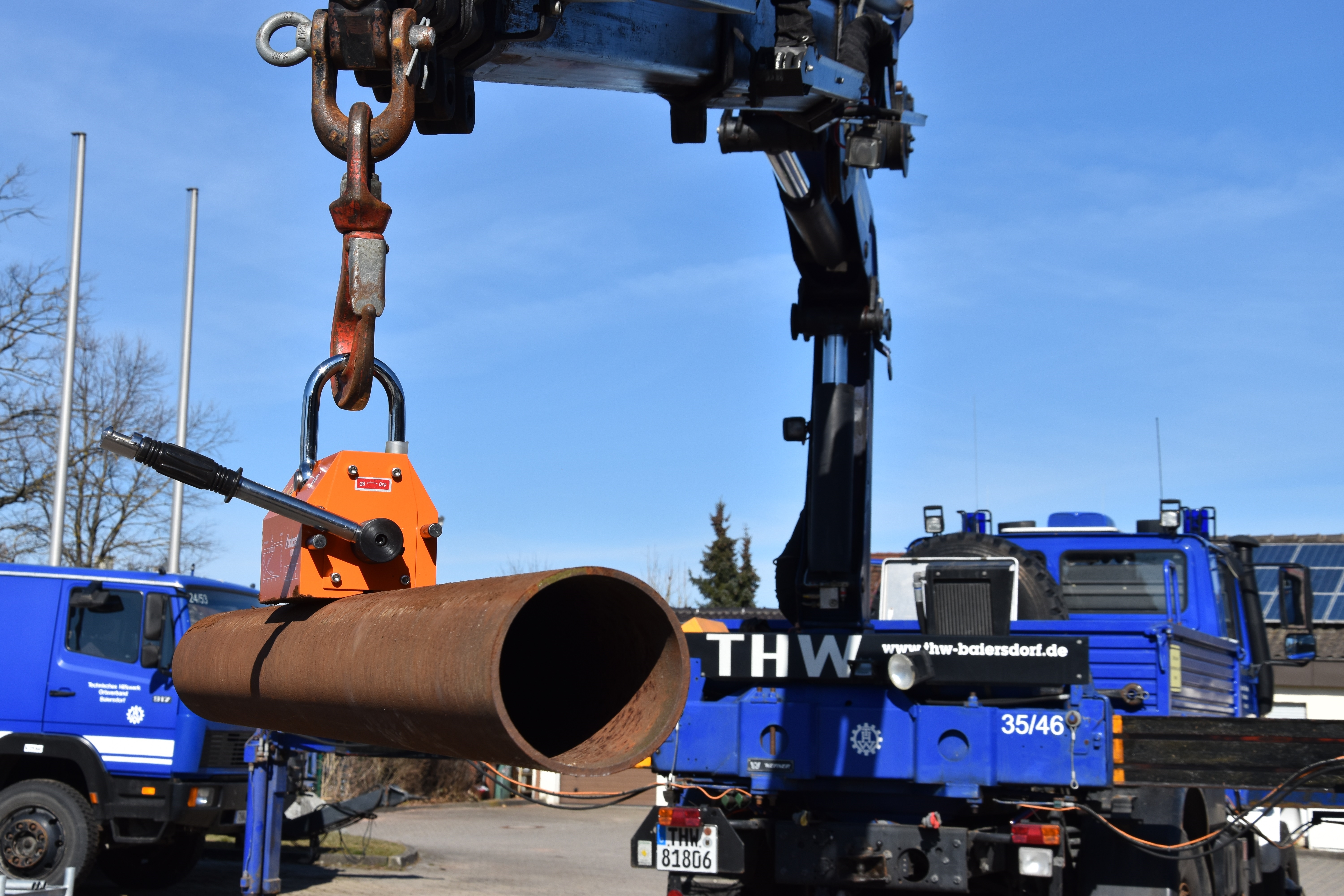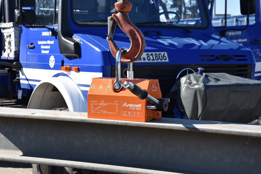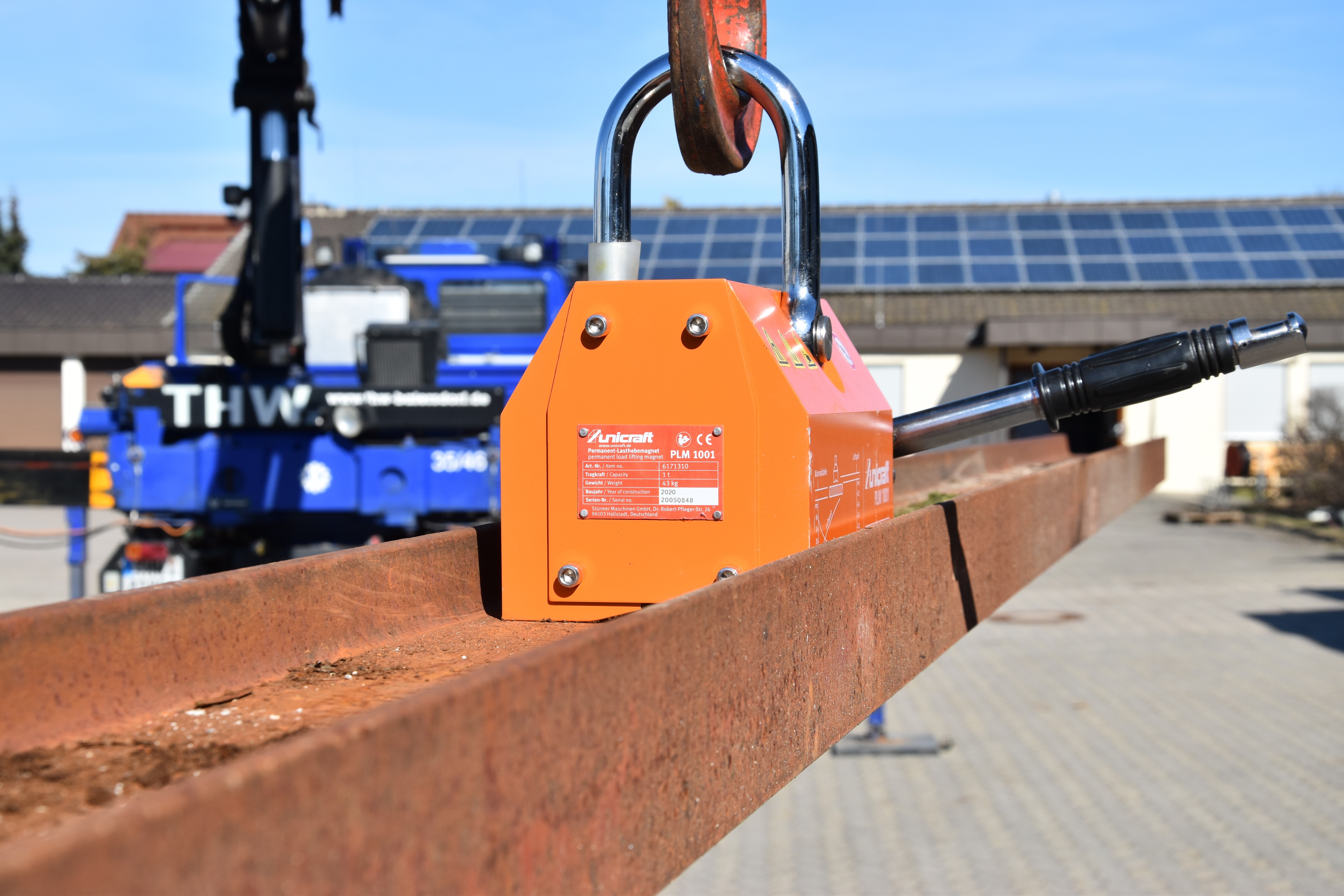 Besonders im Fokus stand dabei ein Lasthebemagnet, um Flach- und Rundmaterial auch an schwer zugänglichen Stellen jederzeit sicher anheben zu können. Die Wahl fiel schließlich auf den Permanent-Lasthebemagnet PLM 1001 von UNICRAFT, der die komplexen Anforderungen der Einsatzkräfte optimal erfüllt. Mit einer Tragkraft von 1.000 kg eignet sich der Lasthebemagnet von UNICRAFT ideal für alle gängigen Anwendungen des THW. Aufgrund seiner einfachen Handhabung und des bequemen Ein- und Ausschaltmechanismus über einen Hebel ist das Modell PLM 1001 jederzeit schnell einsatzbereit, besonders dann, wenn jede Minute zählt. Eine Sicherheitsverriegelung im aktivierten Zustand sorgt für eine Sperrung des Hebels, sodass ein sicherer Kontakt zwischen Magnet und Last zu jedem Zeitpunkt gegeben ist und eine unbeabsichtigte Entmagnetisierung verhindert wird.