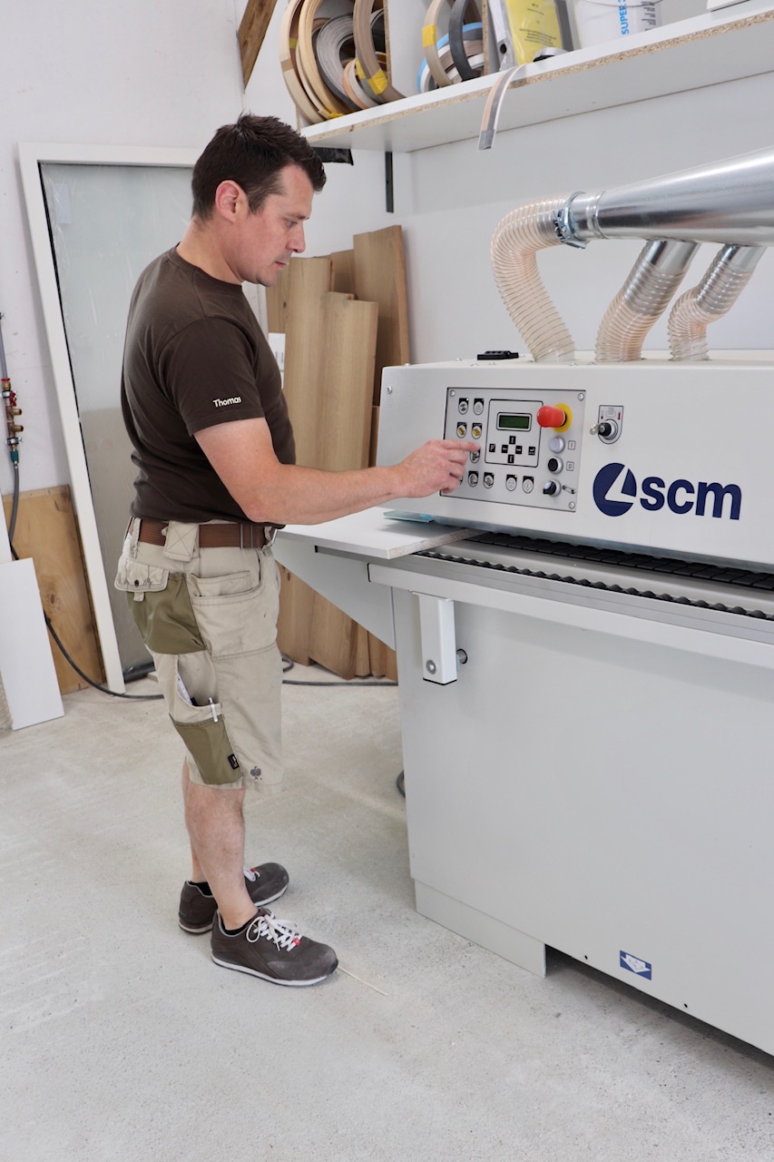 Jungunternehmer Thomas Leidig hat trotz sehr begrenzter Platzverhältnisse in seiner Werkstatt einen leistungsstarken Maschinenpark realisieren können. Beispiel dafür ist die kompakte Kantenanleimmaschine vom Typ Minimax me 35 aus dem Hause Holzkraft.