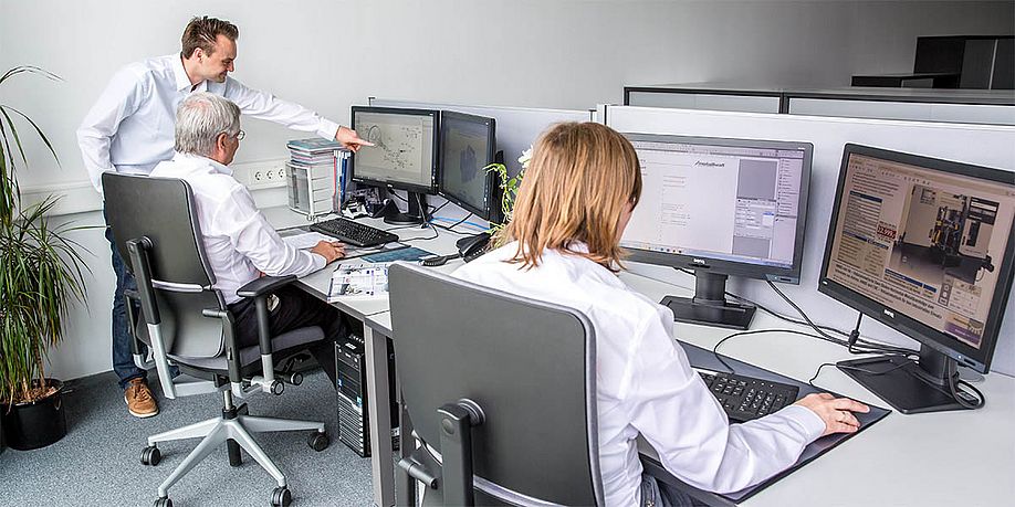 Die Entwicklungsarbeit erfolgt ausschließlich mit modernster 3D-CAD-Software durch Erstellung eines virtuellen Maschinenmodells. Hierbei wird neben der optimalen Funktionalität der Maschinen auch auf die Weiterverwertbarkeit der Daten geachtet, die während der Entwicklungsphase erstellt werden. Diese Daten dienen nicht nur zur Ausarbeitung von Fertigungsunterlagen und Dokumentationen, sondern werden auch zur Berechnung für die computerunterstützte Fertigung sowie für die Visualisierung und Animationen herangezogen.